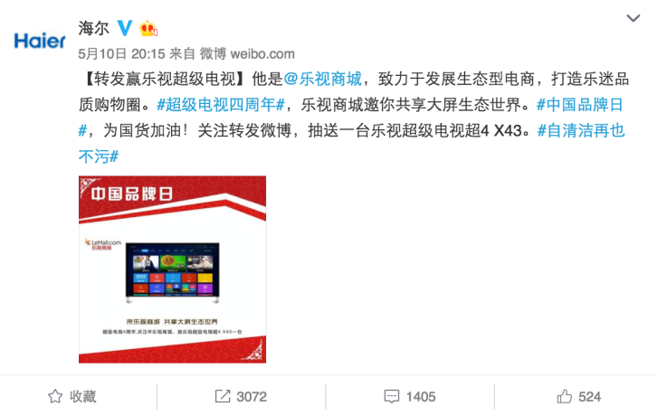 520表白日,海爾搞了一個事情,聯(lián)合60多家藍V,給一位幸運粉絲送禮物。這條轉(zhuǎn)發(fā)評論送禮物的微博在半個小時之內(nèi)就轉(zhuǎn)發(fā)過萬。